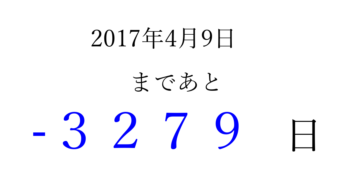 2017年4月9日(日)は もう 0000 日過ぎました 追加すると、トップページからすぐ選べるようになります ※2026/04/01現在の結果です。 最新の状態に更新する ↓シェアして、タイムライン上にカウントダウンを表示しよう!↓ 📤 この結果を共有する Tweet シェア Threads Bluesky 別の日付でカウントダウン 2017年4月のカレンダー このページをブックマークに追加すると、いつでもカウントダウンを確認できます。 (PC: Ctrl+D / Mac: ⌘+D) hitome-notes.comでは以下のページも運営しています。 指定日と期間から日付を計算 | ガチャ確率計算・シミュレーション | プライバシー・ポリシー 運営者:Avocado