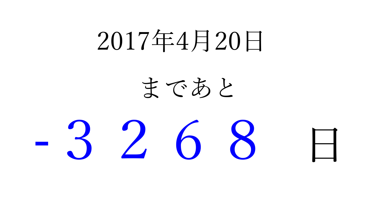 2017年4月20日(木)は もう 0000 日過ぎました 追加すると、トップページからすぐ選べるようになります ※2026/04/01現在の結果です。 最新の状態に更新する ↓シェアして、タイムライン上にカウントダウンを表示しよう!↓ 📤 この結果を共有する Tweet シェア Threads Bluesky 別の日付でカウントダウン 2017年4月のカレンダー このページをブックマークに追加すると、いつでもカウントダウンを確認できます。 (PC: Ctrl+D / Mac: ⌘+D) hitome-notes.comでは以下のページも運営しています。 指定日と期間から日付を計算 | ガチャ確率計算・シミュレーション | プライバシー・ポリシー 運営者:Avocado