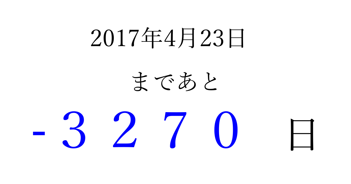 2017年4月23日(日)は もう 0000 日過ぎました 追加すると、トップページからすぐ選べるようになります ※2026/04/06現在の結果です。 最新の状態に更新する ↓シェアして、タイムライン上にカウントダウンを表示しよう!↓ 📤 この結果を共有する Tweet シェア Threads Bluesky 別の日付でカウントダウン 2017年4月のカレンダー このページをブックマークに追加すると、いつでもカウントダウンを確認できます。 (PC: Ctrl+D / Mac: ⌘+D) hitome-notes.comでは以下のページも運営しています。 指定日と期間から日付を計算 | ガチャ確率計算・シミュレーション | プライバシー・ポリシー 運営者:Avocado