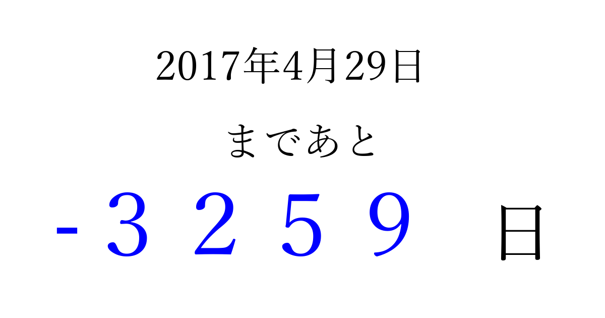 2017年4月29日(土)は もう 0000 日過ぎました 追加すると、トップページからすぐ選べるようになります ※2026/04/01現在の結果です。 最新の状態に更新する ↓シェアして、タイムライン上にカウントダウンを表示しよう!↓ 📤 この結果を共有する Tweet シェア Threads Bluesky 別の日付でカウントダウン 2017年4月のカレンダー このページをブックマークに追加すると、いつでもカウントダウンを確認できます。 (PC: Ctrl+D / Mac: ⌘+D) hitome-notes.comでは以下のページも運営しています。 指定日と期間から日付を計算 | ガチャ確率計算・シミュレーション | プライバシー・ポリシー 運営者:Avocado