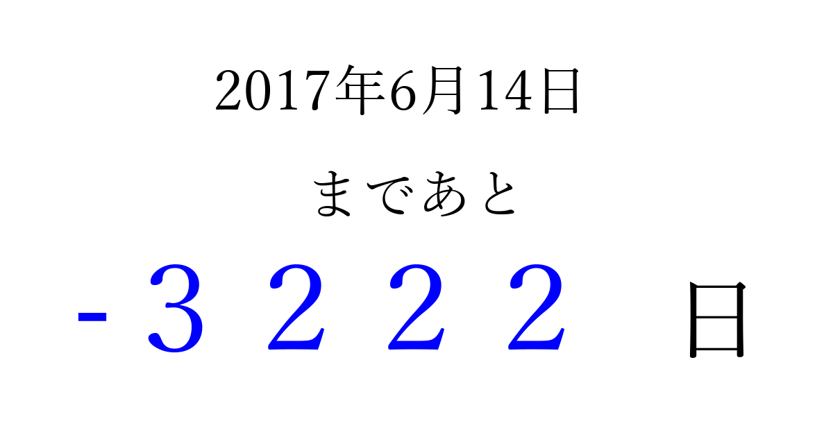 2017年6月14日(水)は もう 0000 日過ぎました 追加すると、トップページからすぐ選べるようになります ※2026/04/10現在の結果です。 最新の状態に更新する ↓シェアして、タイムライン上にカウントダウンを表示しよう!↓ 📤 この結果を共有する Tweet シェア Threads Bluesky 別の日付でカウントダウン 2017年6月のカレンダー このページをブックマークに追加すると、いつでもカウントダウンを確認できます。 (PC: Ctrl+D / Mac: ⌘+D) hitome-notes.comでは以下のページも運営しています。 指定日と期間から日付を計算 | ガチャ確率計算・シミュレーション | プライバシー・ポリシー 運営者:Avocado