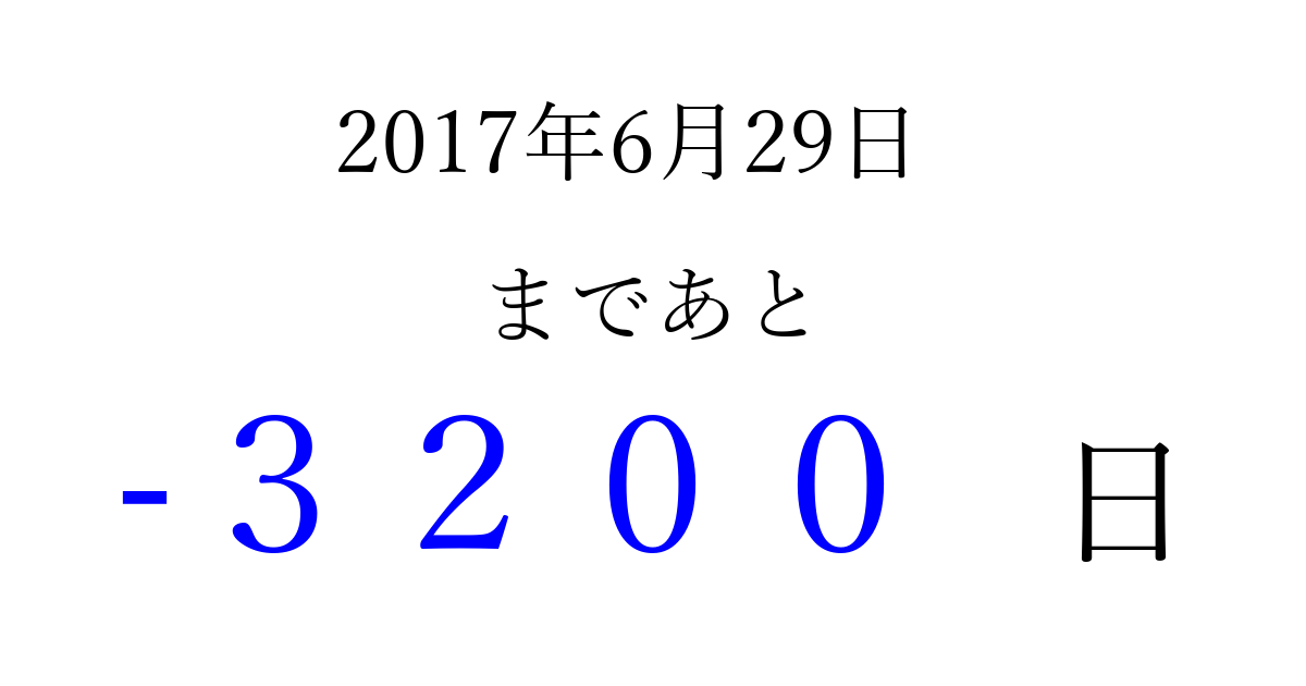 2017年6月29日(木)は もう 0000 日過ぎました 追加すると、トップページからすぐ選べるようになります ※2026/04/03現在の結果です。 最新の状態に更新する ↓シェアして、タイムライン上にカウントダウンを表示しよう!↓ 📤 この結果を共有する Tweet シェア Threads Bluesky 別の日付でカウントダウン 2017年6月のカレンダー このページをブックマークに追加すると、いつでもカウントダウンを確認できます。 (PC: Ctrl+D / Mac: ⌘+D) hitome-notes.comでは以下のページも運営しています。 指定日と期間から日付を計算 | ガチャ確率計算・シミュレーション | プライバシー・ポリシー 運営者:Avocado