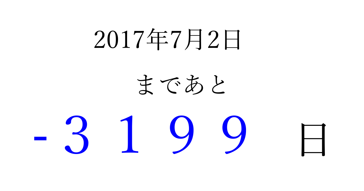 2017年7月2日(日)は もう 0000 日過ぎました 追加すると、トップページからすぐ選べるようになります ※2026/04/05現在の結果です。 最新の状態に更新する ↓シェアして、タイムライン上にカウントダウンを表示しよう!↓ 📤 この結果を共有する Tweet シェア Threads Bluesky 別の日付でカウントダウン 2017年7月のカレンダー このページをブックマークに追加すると、いつでもカウントダウンを確認できます。 (PC: Ctrl+D / Mac: ⌘+D) hitome-notes.comでは以下のページも運営しています。 指定日と期間から日付を計算 | ガチャ確率計算・シミュレーション | プライバシー・ポリシー 運営者:Avocado