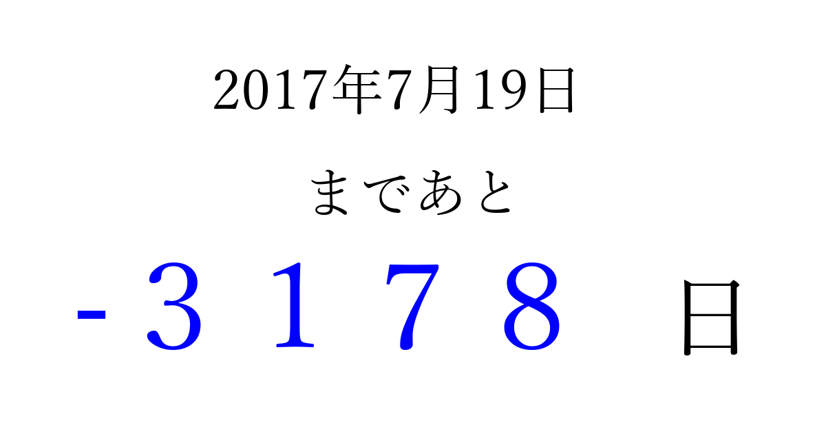 2017年7月19日(水)は もう 0000 日過ぎました 追加すると、トップページからすぐ選べるようになります ※2026/04/01現在の結果です。 最新の状態に更新する ↓シェアして、タイムライン上にカウントダウンを表示しよう!↓ 📤 この結果を共有する Tweet シェア Threads Bluesky 別の日付でカウントダウン 2017年7月のカレンダー このページをブックマークに追加すると、いつでもカウントダウンを確認できます。 (PC: Ctrl+D / Mac: ⌘+D) hitome-notes.comでは以下のページも運営しています。 指定日と期間から日付を計算 | ガチャ確率計算・シミュレーション | プライバシー・ポリシー 運営者:Avocado