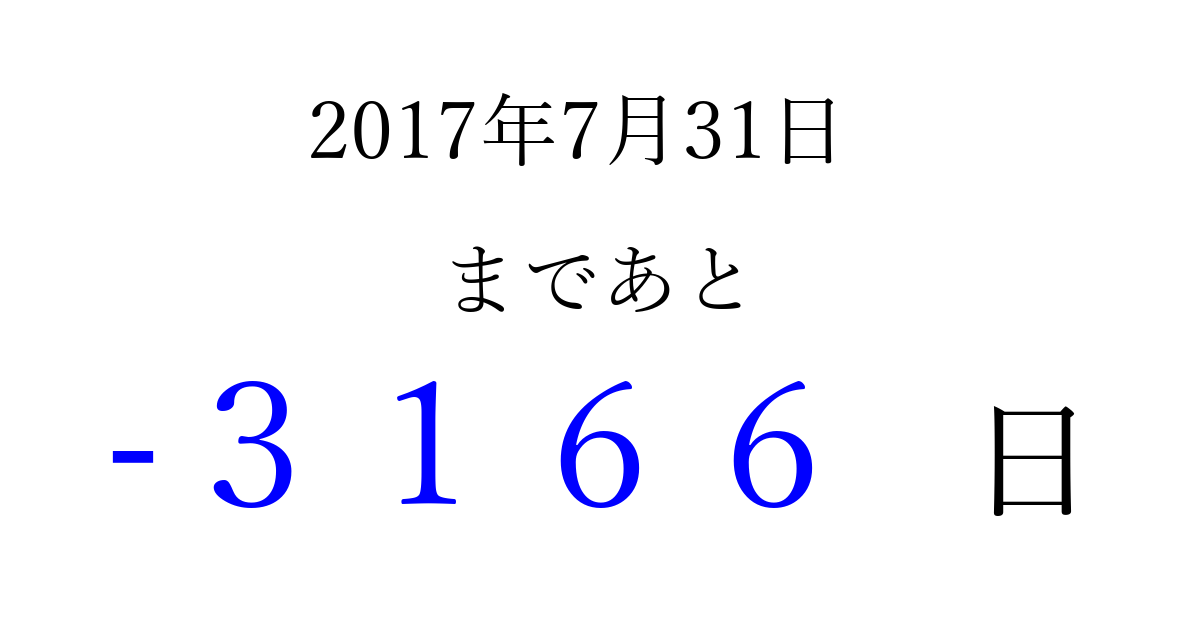 2017年7月31日(月)は もう 0000 日過ぎました 追加すると、トップページからすぐ選べるようになります ※2026/04/01現在の結果です。 最新の状態に更新する ↓シェアして、タイムライン上にカウントダウンを表示しよう!↓ 📤 この結果を共有する Tweet シェア Threads Bluesky 別の日付でカウントダウン 2017年7月のカレンダー このページをブックマークに追加すると、いつでもカウントダウンを確認できます。 (PC: Ctrl+D / Mac: ⌘+D) hitome-notes.comでは以下のページも運営しています。 指定日と期間から日付を計算 | ガチャ確率計算・シミュレーション | プライバシー・ポリシー 運営者:Avocado