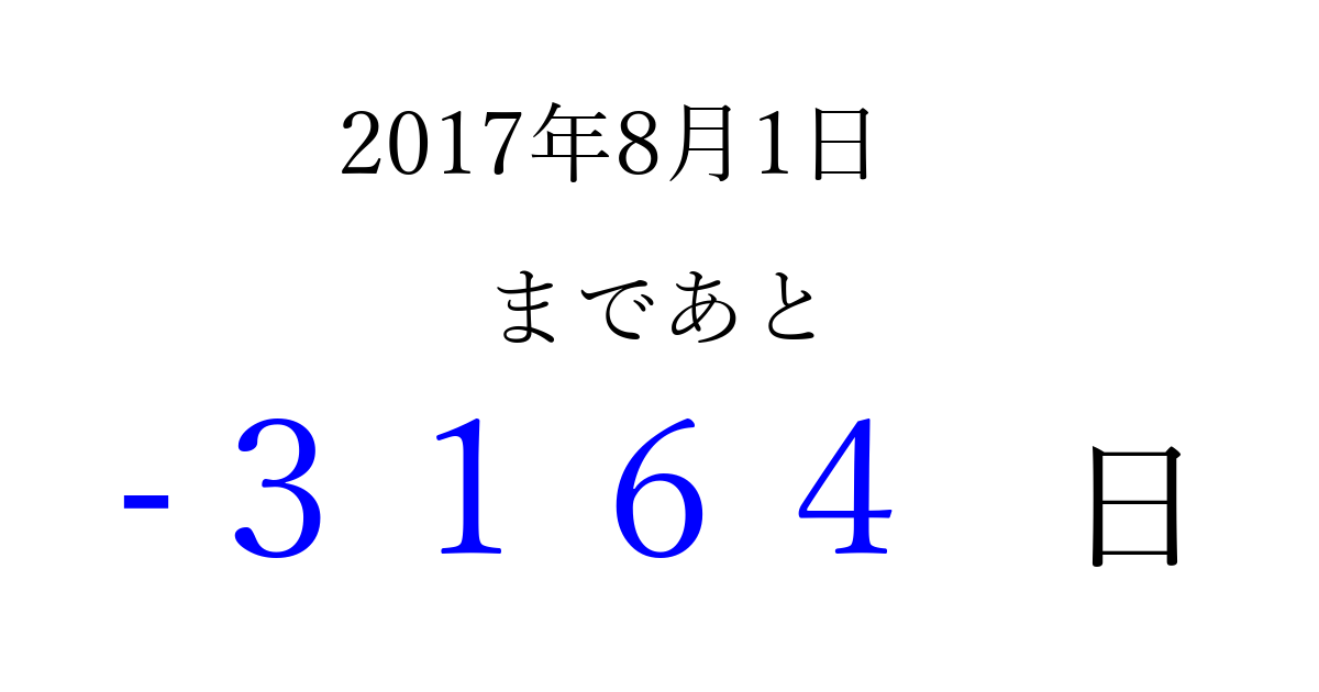 2017年8月1日(火)は もう 0000 日過ぎました 追加すると、トップページからすぐ選べるようになります ※2026/03/31現在の結果です。 最新の状態に更新する ↓シェアして、タイムライン上にカウントダウンを表示しよう!↓ 📤 この結果を共有する Tweet シェア Threads Bluesky 別の日付でカウントダウン 2017年8月のカレンダー このページをブックマークに追加すると、いつでもカウントダウンを確認できます。 (PC: Ctrl+D / Mac: ⌘+D) hitome-notes.comでは以下のページも運営しています。 指定日と期間から日付を計算 | ガチャ確率計算・シミュレーション | プライバシー・ポリシー 運営者:Avocado