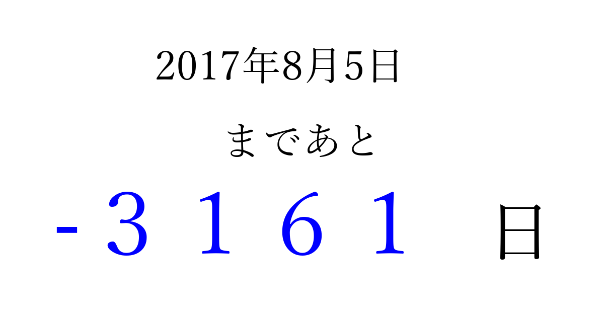 2017年8月5日(土)は もう 0000 日過ぎました 追加すると、トップページからすぐ選べるようになります ※2026/04/01現在の結果です。 最新の状態に更新する ↓シェアして、タイムライン上にカウントダウンを表示しよう!↓ 📤 この結果を共有する Tweet シェア Threads Bluesky 別の日付でカウントダウン 2017年8月のカレンダー このページをブックマークに追加すると、いつでもカウントダウンを確認できます。 (PC: Ctrl+D / Mac: ⌘+D) hitome-notes.comでは以下のページも運営しています。 指定日と期間から日付を計算 | ガチャ確率計算・シミュレーション | プライバシー・ポリシー 運営者:Avocado