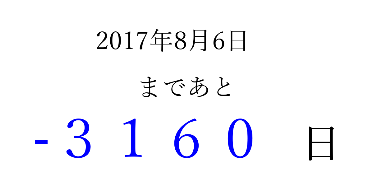 2017年8月6日(日)は もう 0000 日過ぎました 追加すると、トップページからすぐ選べるようになります ※2026/04/01現在の結果です。 最新の状態に更新する ↓シェアして、タイムライン上にカウントダウンを表示しよう!↓ 📤 この結果を共有する Tweet シェア Threads Bluesky 別の日付でカウントダウン 2017年8月のカレンダー このページをブックマークに追加すると、いつでもカウントダウンを確認できます。 (PC: Ctrl+D / Mac: ⌘+D) hitome-notes.comでは以下のページも運営しています。 指定日と期間から日付を計算 | ガチャ確率計算・シミュレーション | プライバシー・ポリシー 運営者:Avocado