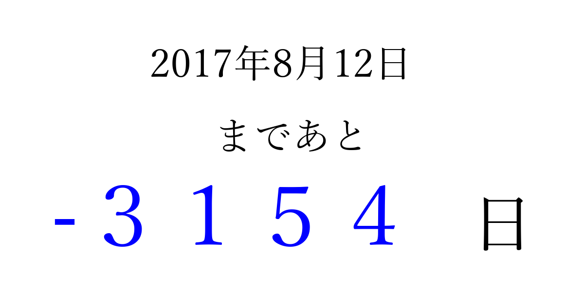 2017年8月12日(土)は もう 0000 日過ぎました 追加すると、トップページからすぐ選べるようになります ※2026/04/01現在の結果です。 最新の状態に更新する ↓シェアして、タイムライン上にカウントダウンを表示しよう!↓ 📤 この結果を共有する Tweet シェア Threads Bluesky 別の日付でカウントダウン 2017年8月のカレンダー このページをブックマークに追加すると、いつでもカウントダウンを確認できます。 (PC: Ctrl+D / Mac: ⌘+D) hitome-notes.comでは以下のページも運営しています。 指定日と期間から日付を計算 | ガチャ確率計算・シミュレーション | プライバシー・ポリシー 運営者:Avocado