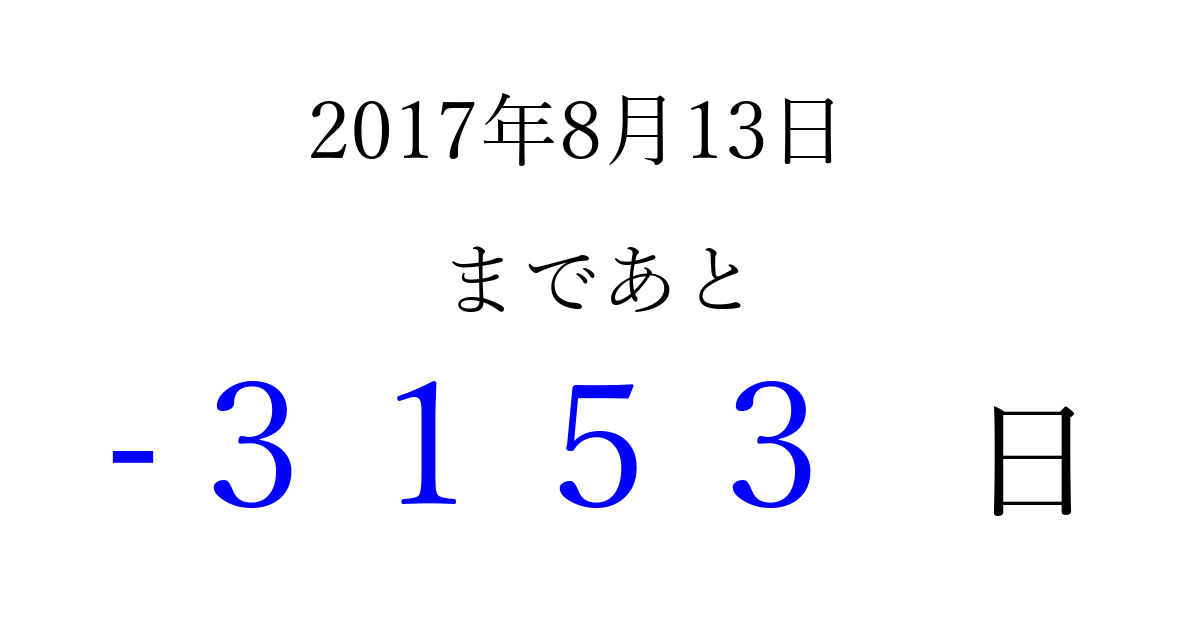 2017年8月13日(日)は もう 0000 日過ぎました 追加すると、トップページからすぐ選べるようになります ※2026/04/01現在の結果です。 最新の状態に更新する ↓シェアして、タイムライン上にカウントダウンを表示しよう!↓ 📤 この結果を共有する Tweet シェア Threads Bluesky 別の日付でカウントダウン 2017年8月のカレンダー このページをブックマークに追加すると、いつでもカウントダウンを確認できます。 (PC: Ctrl+D / Mac: ⌘+D) hitome-notes.comでは以下のページも運営しています。 指定日と期間から日付を計算 | ガチャ確率計算・シミュレーション | プライバシー・ポリシー 運営者:Avocado