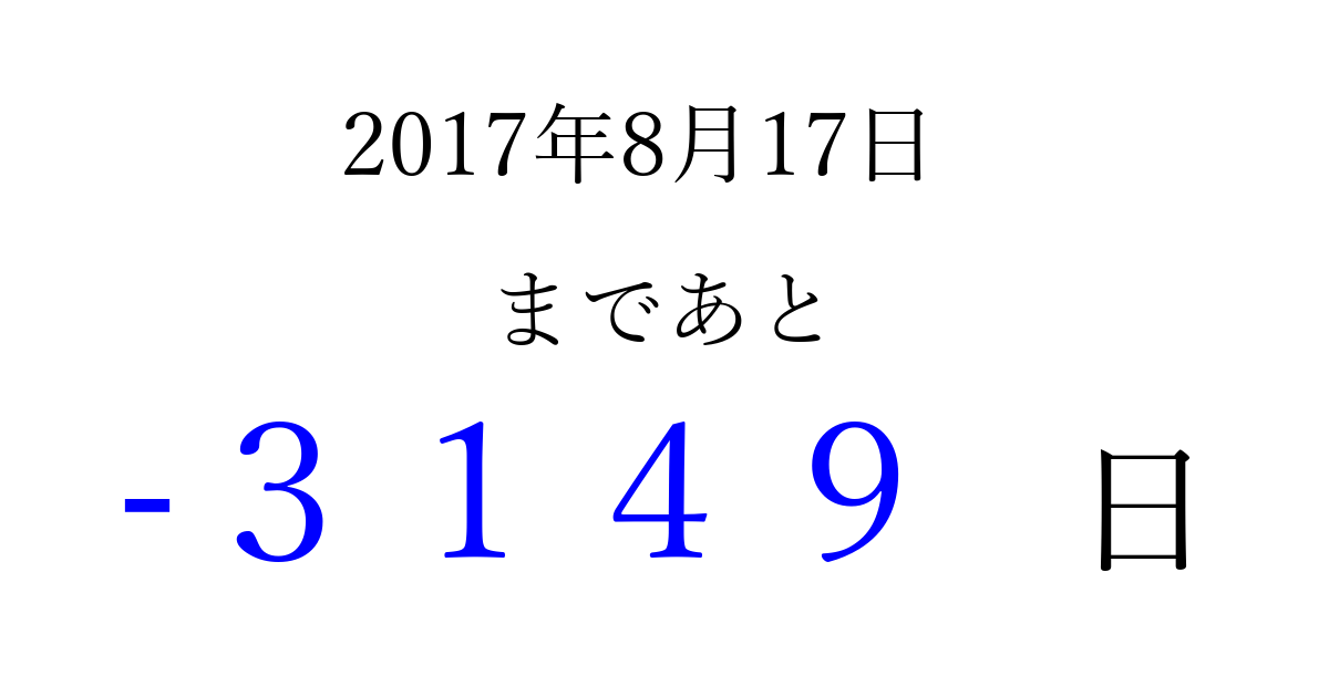 2017年8月17日(木)は もう 0000 日過ぎました 追加すると、トップページからすぐ選べるようになります ※2026/04/01現在の結果です。 最新の状態に更新する ↓シェアして、タイムライン上にカウントダウンを表示しよう!↓ 📤 この結果を共有する Tweet シェア Threads Bluesky 別の日付でカウントダウン 2017年8月のカレンダー このページをブックマークに追加すると、いつでもカウントダウンを確認できます。 (PC: Ctrl+D / Mac: ⌘+D) hitome-notes.comでは以下のページも運営しています。 指定日と期間から日付を計算 | ガチャ確率計算・シミュレーション | プライバシー・ポリシー 運営者:Avocado