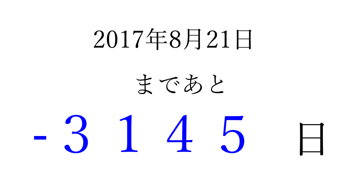 2017年8月21日(月)は もう 0000 日過ぎました 追加すると、トップページからすぐ選べるようになります ※2026/04/01現在の結果です。 最新の状態に更新する ↓シェアして、タイムライン上にカウントダウンを表示しよう!↓ 📤 この結果を共有する Tweet シェア Threads Bluesky 別の日付でカウントダウン 2017年8月のカレンダー このページをブックマークに追加すると、いつでもカウントダウンを確認できます。 (PC: Ctrl+D / Mac: ⌘+D) hitome-notes.comでは以下のページも運営しています。 指定日と期間から日付を計算 | ガチャ確率計算・シミュレーション | プライバシー・ポリシー 運営者:Avocado