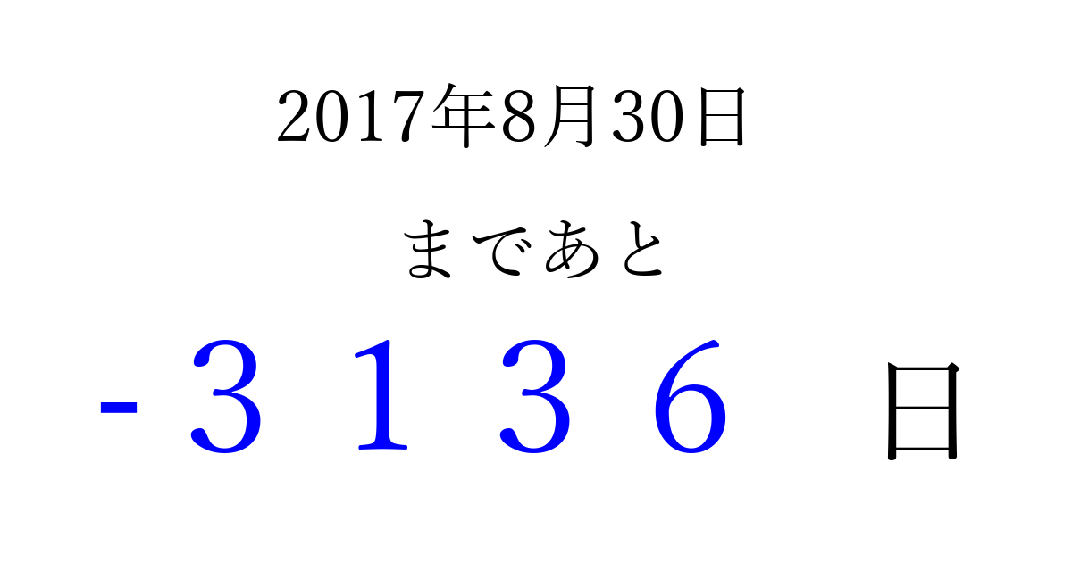 2017年8月30日(水)は もう 0000 日過ぎました 追加すると、トップページからすぐ選べるようになります ※2026/04/01現在の結果です。 最新の状態に更新する ↓シェアして、タイムライン上にカウントダウンを表示しよう!↓ 📤 この結果を共有する Tweet シェア Threads Bluesky 別の日付でカウントダウン 2017年8月のカレンダー このページをブックマークに追加すると、いつでもカウントダウンを確認できます。 (PC: Ctrl+D / Mac: ⌘+D) hitome-notes.comでは以下のページも運営しています。 指定日と期間から日付を計算 | ガチャ確率計算・シミュレーション | プライバシー・ポリシー 運営者:Avocado