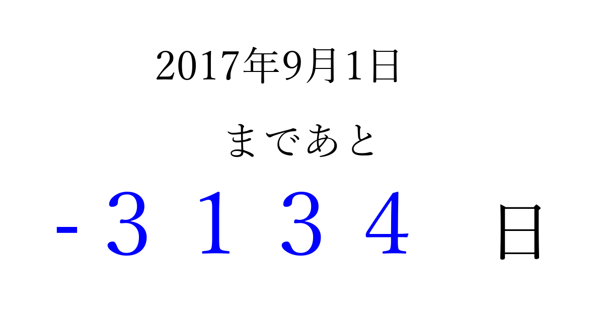 2017年9月1日(金)は もう 0000 日過ぎました 追加すると、トップページからすぐ選べるようになります ※2026/04/01現在の結果です。 最新の状態に更新する ↓シェアして、タイムライン上にカウントダウンを表示しよう!↓ 📤 この結果を共有する Tweet シェア Threads Bluesky 別の日付でカウントダウン 2017年9月のカレンダー このページをブックマークに追加すると、いつでもカウントダウンを確認できます。 (PC: Ctrl+D / Mac: ⌘+D) hitome-notes.comでは以下のページも運営しています。 指定日と期間から日付を計算 | ガチャ確率計算・シミュレーション | プライバシー・ポリシー 運営者:Avocado