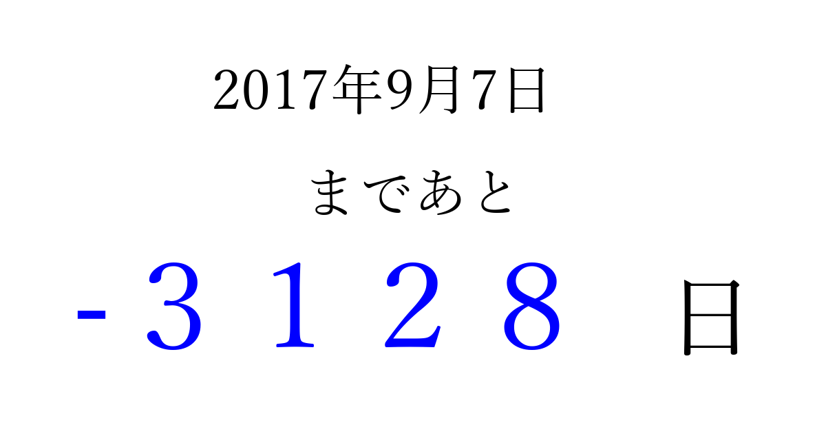 2017年9月7日(木)は もう 0000 日過ぎました 追加すると、トップページからすぐ選べるようになります ※2026/04/01現在の結果です。 最新の状態に更新する ↓シェアして、タイムライン上にカウントダウンを表示しよう!↓ 📤 この結果を共有する Tweet シェア Threads Bluesky 別の日付でカウントダウン 2017年9月のカレンダー このページをブックマークに追加すると、いつでもカウントダウンを確認できます。 (PC: Ctrl+D / Mac: ⌘+D) hitome-notes.comでは以下のページも運営しています。 指定日と期間から日付を計算 | ガチャ確率計算・シミュレーション | プライバシー・ポリシー 運営者:Avocado