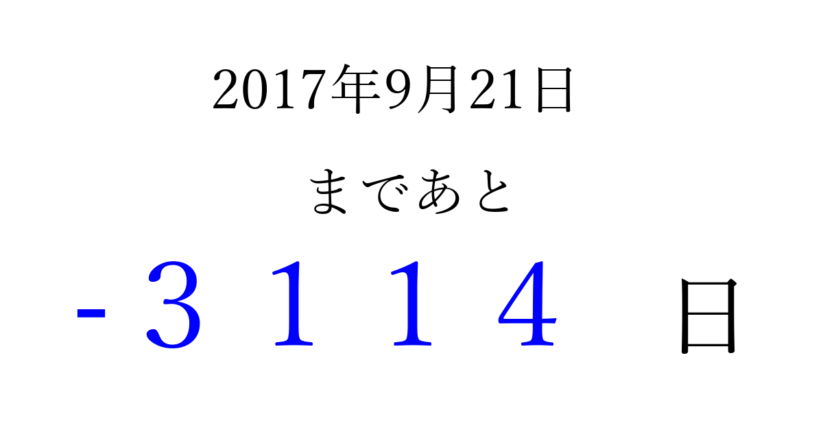 2017年9月21日(木)は もう 0000 日過ぎました 追加すると、トップページからすぐ選べるようになります ※2026/04/01現在の結果です。 最新の状態に更新する ↓シェアして、タイムライン上にカウントダウンを表示しよう!↓ 📤 この結果を共有する Tweet シェア Threads Bluesky 別の日付でカウントダウン 2017年9月のカレンダー このページをブックマークに追加すると、いつでもカウントダウンを確認できます。 (PC: Ctrl+D / Mac: ⌘+D) hitome-notes.comでは以下のページも運営しています。 指定日と期間から日付を計算 | ガチャ確率計算・シミュレーション | プライバシー・ポリシー 運営者:Avocado