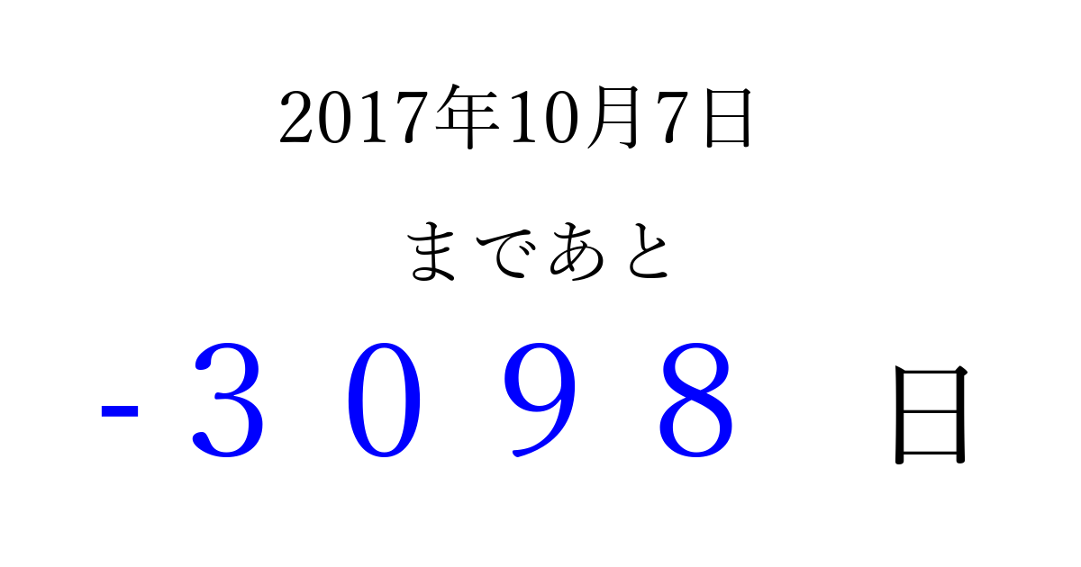 2017年10月7日(土)は もう 0000 日過ぎました 追加すると、トップページからすぐ選べるようになります ※2026/04/01現在の結果です。 最新の状態に更新する ↓シェアして、タイムライン上にカウントダウンを表示しよう!↓ 📤 この結果を共有する Tweet シェア Threads Bluesky 別の日付でカウントダウン 2017年10月のカレンダー このページをブックマークに追加すると、いつでもカウントダウンを確認できます。 (PC: Ctrl+D / Mac: ⌘+D) hitome-notes.comでは以下のページも運営しています。 指定日と期間から日付を計算 | ガチャ確率計算・シミュレーション | プライバシー・ポリシー 運営者:Avocado