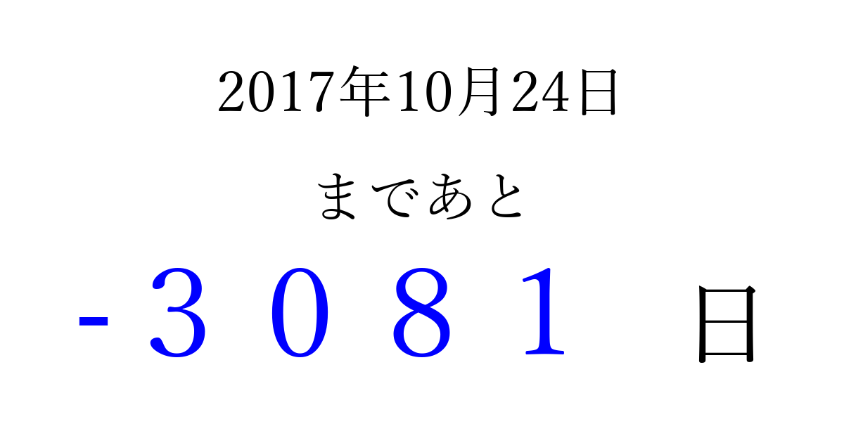 2017年10月24日(火)は もう 0000 日過ぎました 追加すると、トップページからすぐ選べるようになります ※2026/04/01現在の結果です。 最新の状態に更新する ↓シェアして、タイムライン上にカウントダウンを表示しよう!↓ 📤 この結果を共有する Tweet シェア Threads Bluesky 別の日付でカウントダウン 2017年10月のカレンダー このページをブックマークに追加すると、いつでもカウントダウンを確認できます。 (PC: Ctrl+D / Mac: ⌘+D) hitome-notes.comでは以下のページも運営しています。 指定日と期間から日付を計算 | ガチャ確率計算・シミュレーション | プライバシー・ポリシー 運営者:Avocado