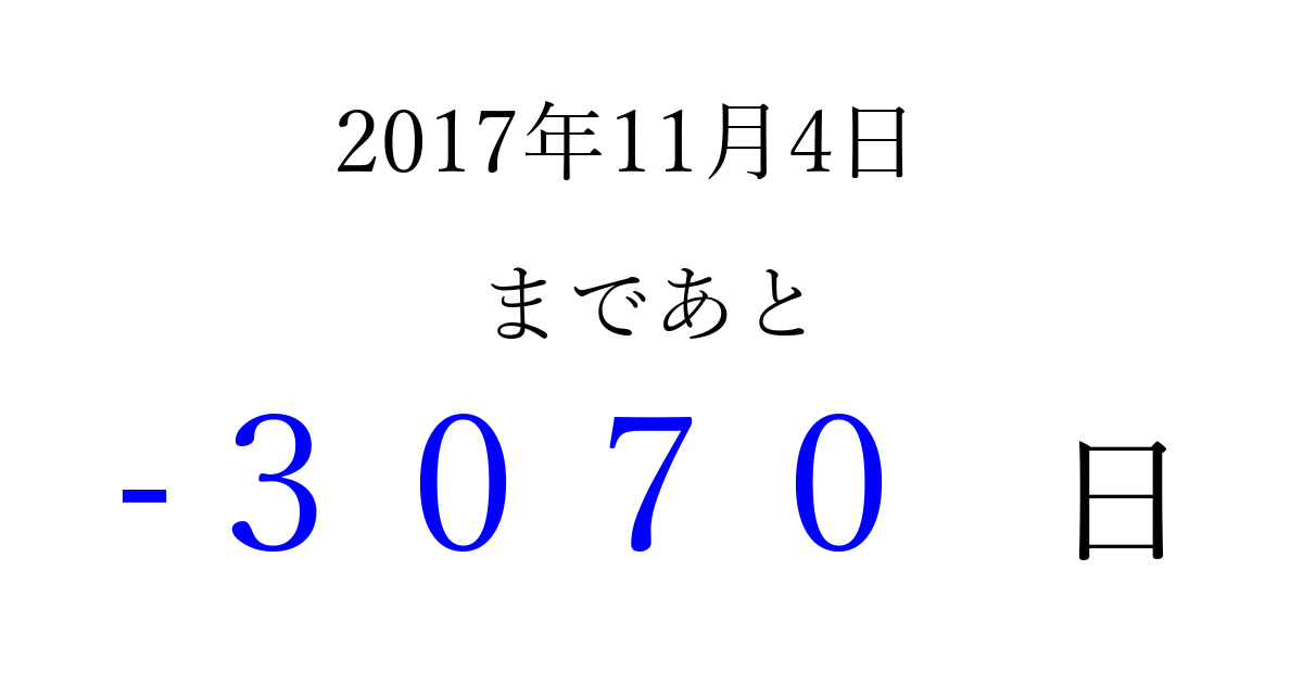 2017年11月4日(土)は もう 0000 日過ぎました 追加すると、トップページからすぐ選べるようになります ※2026/04/01現在の結果です。 最新の状態に更新する ↓シェアして、タイムライン上にカウントダウンを表示しよう!↓ 📤 この結果を共有する Tweet シェア Threads Bluesky 別の日付でカウントダウン 2017年11月のカレンダー このページをブックマークに追加すると、いつでもカウントダウンを確認できます。 (PC: Ctrl+D / Mac: ⌘+D) hitome-notes.comでは以下のページも運営しています。 指定日と期間から日付を計算 | ガチャ確率計算・シミュレーション | プライバシー・ポリシー 運営者:Avocado