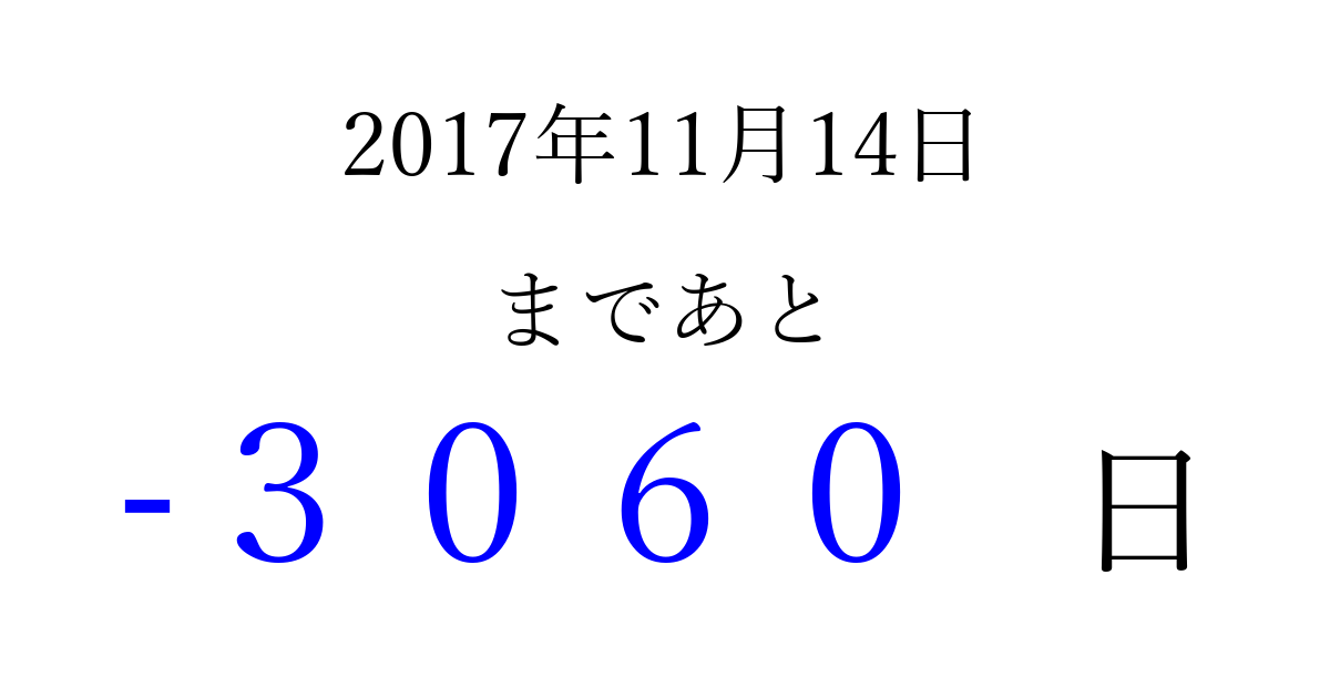 2017年11月14日(火)は もう 0000 日過ぎました 追加すると、トップページからすぐ選べるようになります ※2026/04/01現在の結果です。 最新の状態に更新する ↓シェアして、タイムライン上にカウントダウンを表示しよう!↓ 📤 この結果を共有する Tweet シェア Threads Bluesky 別の日付でカウントダウン 2017年11月のカレンダー このページをブックマークに追加すると、いつでもカウントダウンを確認できます。 (PC: Ctrl+D / Mac: ⌘+D) hitome-notes.comでは以下のページも運営しています。 指定日と期間から日付を計算 | ガチャ確率計算・シミュレーション | プライバシー・ポリシー 運営者:Avocado