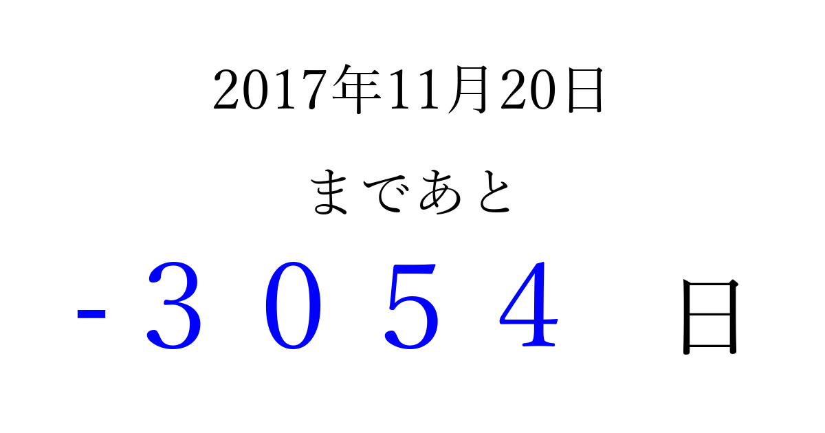 2017年11月20日(月)は もう 0000 日過ぎました 追加すると、トップページからすぐ選べるようになります ※2026/04/01現在の結果です。 最新の状態に更新する ↓シェアして、タイムライン上にカウントダウンを表示しよう!↓ 📤 この結果を共有する Tweet シェア Threads Bluesky 別の日付でカウントダウン 2017年11月のカレンダー このページをブックマークに追加すると、いつでもカウントダウンを確認できます。 (PC: Ctrl+D / Mac: ⌘+D) hitome-notes.comでは以下のページも運営しています。 指定日と期間から日付を計算 | ガチャ確率計算・シミュレーション | プライバシー・ポリシー 運営者:Avocado