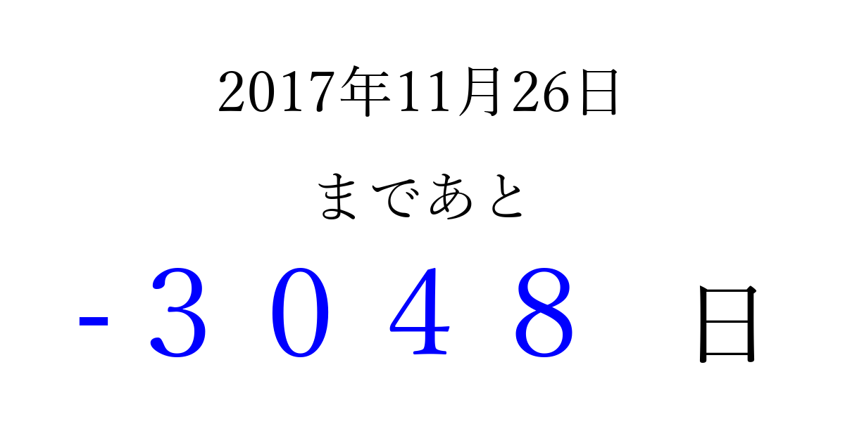 2017年11月26日(日)は もう 0000 日過ぎました 追加すると、トップページからすぐ選べるようになります ※2026/04/01現在の結果です。 最新の状態に更新する ↓シェアして、タイムライン上にカウントダウンを表示しよう!↓ 📤 この結果を共有する Tweet シェア Threads Bluesky 別の日付でカウントダウン 2017年11月のカレンダー このページをブックマークに追加すると、いつでもカウントダウンを確認できます。 (PC: Ctrl+D / Mac: ⌘+D) hitome-notes.comでは以下のページも運営しています。 指定日と期間から日付を計算 | ガチャ確率計算・シミュレーション | プライバシー・ポリシー 運営者:Avocado