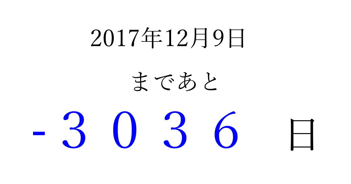 2017年12月9日(土)は もう 0000 日過ぎました 追加すると、トップページからすぐ選べるようになります ※2026/04/02現在の結果です。 最新の状態に更新する ↓シェアして、タイムライン上にカウントダウンを表示しよう!↓ 📤 この結果を共有する Tweet シェア Threads Bluesky 別の日付でカウントダウン 2017年12月のカレンダー このページをブックマークに追加すると、いつでもカウントダウンを確認できます。 (PC: Ctrl+D / Mac: ⌘+D) hitome-notes.comでは以下のページも運営しています。 指定日と期間から日付を計算 | ガチャ確率計算・シミュレーション | プライバシー・ポリシー 運営者:Avocado