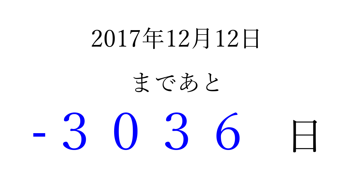 2017年12月12日(火)は もう 0000 日過ぎました 追加すると、トップページからすぐ選べるようになります ※2026/04/05現在の結果です。 最新の状態に更新する ↓シェアして、タイムライン上にカウントダウンを表示しよう!↓ 📤 この結果を共有する Tweet シェア Threads Bluesky 別の日付でカウントダウン 2017年12月のカレンダー このページをブックマークに追加すると、いつでもカウントダウンを確認できます。 (PC: Ctrl+D / Mac: ⌘+D) hitome-notes.comでは以下のページも運営しています。 指定日と期間から日付を計算 | ガチャ確率計算・シミュレーション | プライバシー・ポリシー 運営者:Avocado