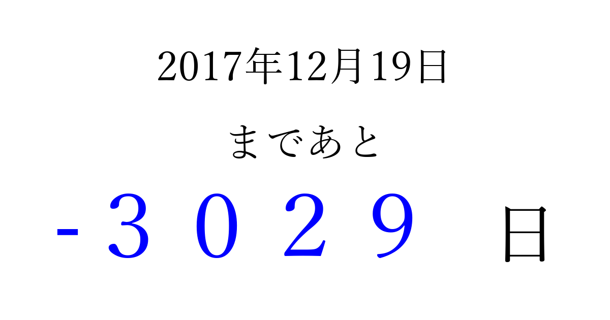 2017年12月19日(火)は もう 0000 日過ぎました 追加すると、トップページからすぐ選べるようになります ※2026/04/05現在の結果です。 最新の状態に更新する ↓シェアして、タイムライン上にカウントダウンを表示しよう!↓ 📤 この結果を共有する Tweet シェア Threads Bluesky 別の日付でカウントダウン 2017年12月のカレンダー このページをブックマークに追加すると、いつでもカウントダウンを確認できます。 (PC: Ctrl+D / Mac: ⌘+D) hitome-notes.comでは以下のページも運営しています。 指定日と期間から日付を計算 | ガチャ確率計算・シミュレーション | プライバシー・ポリシー 運営者:Avocado