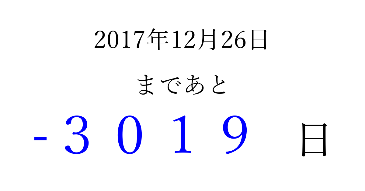 2017年12月26日(火)は もう 0000 日過ぎました 追加すると、トップページからすぐ選べるようになります ※2026/04/02現在の結果です。 最新の状態に更新する ↓シェアして、タイムライン上にカウントダウンを表示しよう!↓ 📤 この結果を共有する Tweet シェア Threads Bluesky 別の日付でカウントダウン 2017年12月のカレンダー このページをブックマークに追加すると、いつでもカウントダウンを確認できます。 (PC: Ctrl+D / Mac: ⌘+D) hitome-notes.comでは以下のページも運営しています。 指定日と期間から日付を計算 | ガチャ確率計算・シミュレーション | プライバシー・ポリシー 運営者:Avocado