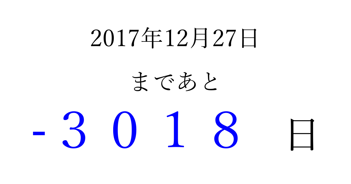 2017年12月27日(水)は もう 0000 日過ぎました 追加すると、トップページからすぐ選べるようになります ※2026/04/02現在の結果です。 最新の状態に更新する ↓シェアして、タイムライン上にカウントダウンを表示しよう!↓ 📤 この結果を共有する Tweet シェア Threads Bluesky 別の日付でカウントダウン 2017年12月のカレンダー このページをブックマークに追加すると、いつでもカウントダウンを確認できます。 (PC: Ctrl+D / Mac: ⌘+D) hitome-notes.comでは以下のページも運営しています。 指定日と期間から日付を計算 | ガチャ確率計算・シミュレーション | プライバシー・ポリシー 運営者:Avocado