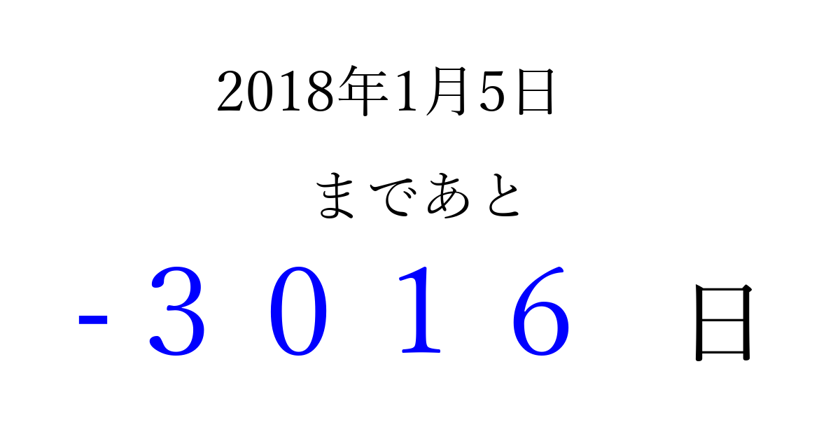 2018年1月5日(金)は もう 0000 日過ぎました 追加すると、トップページからすぐ選べるようになります ※2026/04/09現在の結果です。 最新の状態に更新する ↓シェアして、タイムライン上にカウントダウンを表示しよう!↓ 📤 この結果を共有する Tweet シェア Threads Bluesky 別の日付でカウントダウン 2018年1月のカレンダー このページをブックマークに追加すると、いつでもカウントダウンを確認できます。 (PC: Ctrl+D / Mac: ⌘+D) hitome-notes.comでは以下のページも運営しています。 指定日と期間から日付を計算 | ガチャ確率計算・シミュレーション | プライバシー・ポリシー 運営者:Avocado
