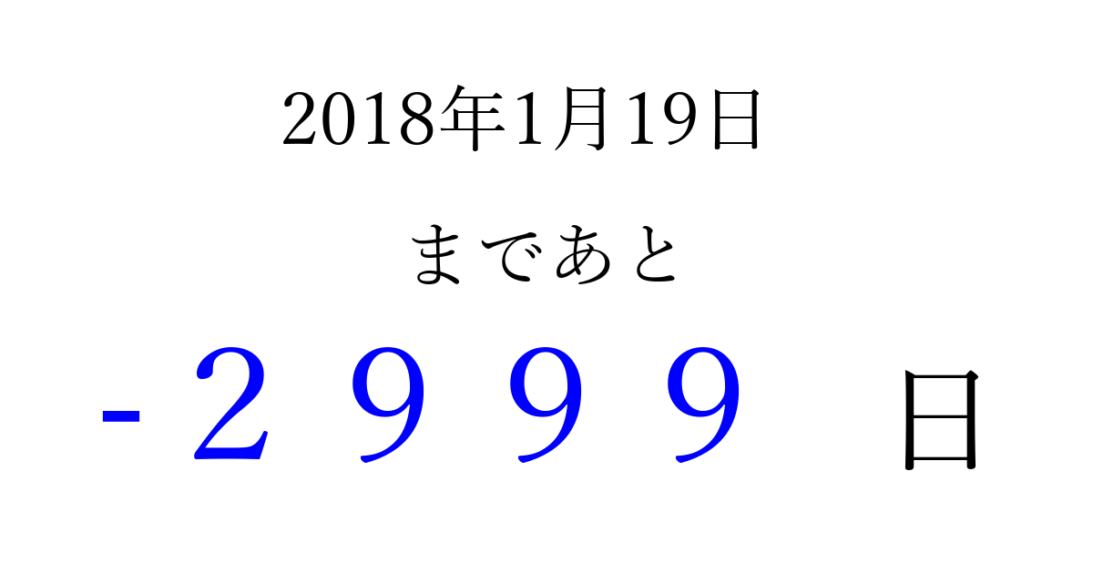 2018年1月19日(金)は もう 0000 日過ぎました 追加すると、トップページからすぐ選べるようになります ※2026/04/06現在の結果です。 最新の状態に更新する ↓シェアして、タイムライン上にカウントダウンを表示しよう!↓ 📤 この結果を共有する Tweet シェア Threads Bluesky 別の日付でカウントダウン 2018年1月のカレンダー このページをブックマークに追加すると、いつでもカウントダウンを確認できます。 (PC: Ctrl+D / Mac: ⌘+D) hitome-notes.comでは以下のページも運営しています。 指定日と期間から日付を計算 | ガチャ確率計算・シミュレーション | プライバシー・ポリシー 運営者:Avocado