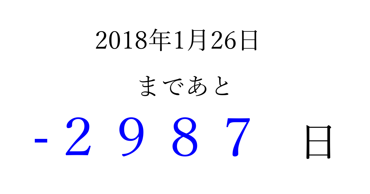 2018年1月26日(金)は もう 0000 日過ぎました 追加すると、トップページからすぐ選べるようになります ※2026/04/01現在の結果です。 最新の状態に更新する ↓シェアして、タイムライン上にカウントダウンを表示しよう!↓ 📤 この結果を共有する Tweet シェア Threads Bluesky 別の日付でカウントダウン 2018年1月のカレンダー このページをブックマークに追加すると、いつでもカウントダウンを確認できます。 (PC: Ctrl+D / Mac: ⌘+D) hitome-notes.comでは以下のページも運営しています。 指定日と期間から日付を計算 | ガチャ確率計算・シミュレーション | プライバシー・ポリシー 運営者:Avocado