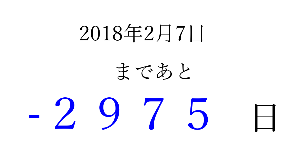 2018年2月7日(水)は もう 0000 日過ぎました 追加すると、トップページからすぐ選べるようになります ※2026/04/01現在の結果です。 最新の状態に更新する ↓シェアして、タイムライン上にカウントダウンを表示しよう!↓ 📤 この結果を共有する Tweet シェア Threads Bluesky 別の日付でカウントダウン 2018年2月のカレンダー このページをブックマークに追加すると、いつでもカウントダウンを確認できます。 (PC: Ctrl+D / Mac: ⌘+D) hitome-notes.comでは以下のページも運営しています。 指定日と期間から日付を計算 | ガチャ確率計算・シミュレーション | プライバシー・ポリシー 運営者:Avocado