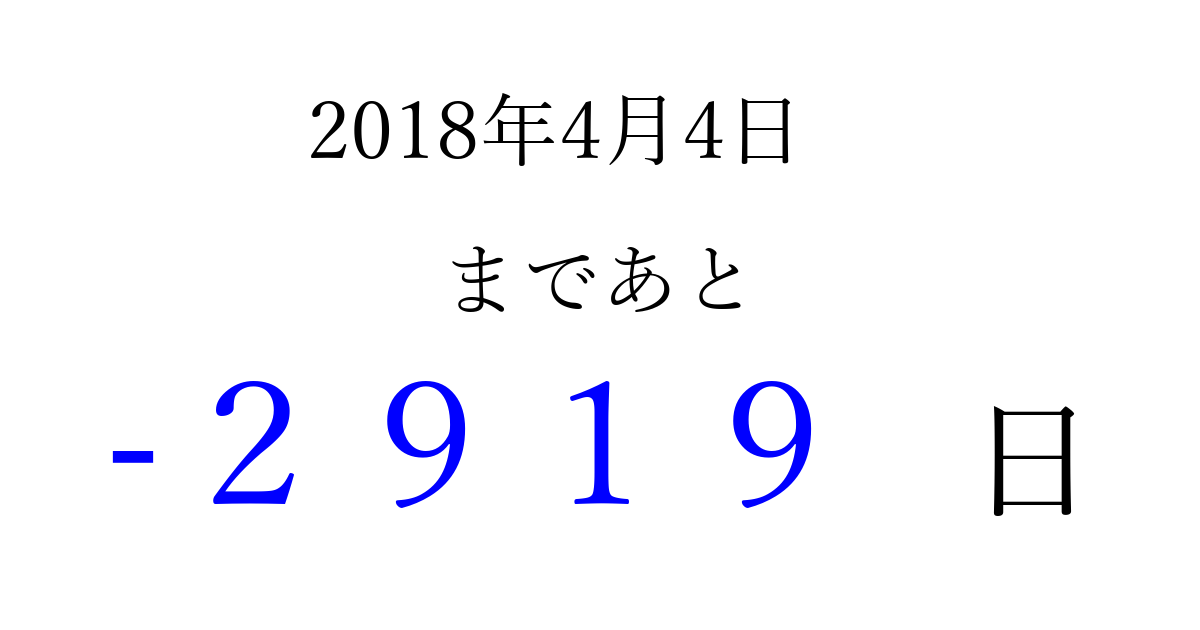 2018年4月4日(水)は もう 0000 日過ぎました 追加すると、トップページからすぐ選べるようになります ※2026/04/01現在の結果です。 最新の状態に更新する ↓シェアして、タイムライン上にカウントダウンを表示しよう!↓ 📤 この結果を共有する Tweet シェア Threads Bluesky 別の日付でカウントダウン 2018年4月のカレンダー このページをブックマークに追加すると、いつでもカウントダウンを確認できます。 (PC: Ctrl+D / Mac: ⌘+D) hitome-notes.comでは以下のページも運営しています。 指定日と期間から日付を計算 | ガチャ確率計算・シミュレーション | プライバシー・ポリシー 運営者:Avocado