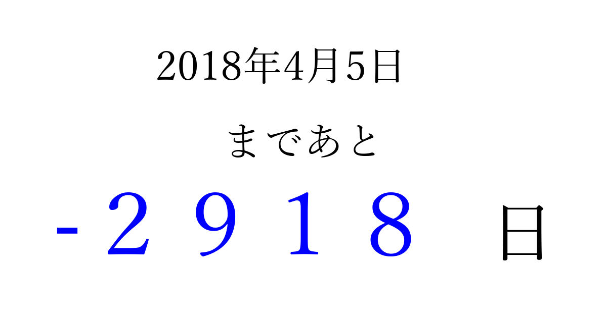 2018年4月5日(木)は もう 0000 日過ぎました 追加すると、トップページからすぐ選べるようになります ※2026/04/01現在の結果です。 最新の状態に更新する ↓シェアして、タイムライン上にカウントダウンを表示しよう!↓ 📤 この結果を共有する Tweet シェア Threads Bluesky 別の日付でカウントダウン 2018年4月のカレンダー このページをブックマークに追加すると、いつでもカウントダウンを確認できます。 (PC: Ctrl+D / Mac: ⌘+D) hitome-notes.comでは以下のページも運営しています。 指定日と期間から日付を計算 | ガチャ確率計算・シミュレーション | プライバシー・ポリシー 運営者:Avocado