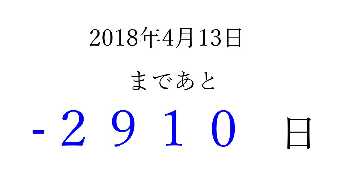 2018年4月13日(金)は もう 0000 日過ぎました 追加すると、トップページからすぐ選べるようになります ※2026/04/01現在の結果です。 最新の状態に更新する ↓シェアして、タイムライン上にカウントダウンを表示しよう!↓ 📤 この結果を共有する Tweet シェア Threads Bluesky 別の日付でカウントダウン 2018年4月のカレンダー このページをブックマークに追加すると、いつでもカウントダウンを確認できます。 (PC: Ctrl+D / Mac: ⌘+D) hitome-notes.comでは以下のページも運営しています。 指定日と期間から日付を計算 | ガチャ確率計算・シミュレーション | プライバシー・ポリシー 運営者:Avocado