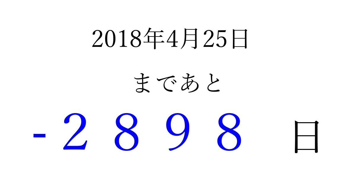 2018年4月25日(水)は もう 0000 日過ぎました 追加すると、トップページからすぐ選べるようになります ※2026/04/01現在の結果です。 最新の状態に更新する ↓シェアして、タイムライン上にカウントダウンを表示しよう!↓ 📤 この結果を共有する Tweet シェア Threads Bluesky 別の日付でカウントダウン 2018年4月のカレンダー このページをブックマークに追加すると、いつでもカウントダウンを確認できます。 (PC: Ctrl+D / Mac: ⌘+D) hitome-notes.comでは以下のページも運営しています。 指定日と期間から日付を計算 | ガチャ確率計算・シミュレーション | プライバシー・ポリシー 運営者:Avocado
