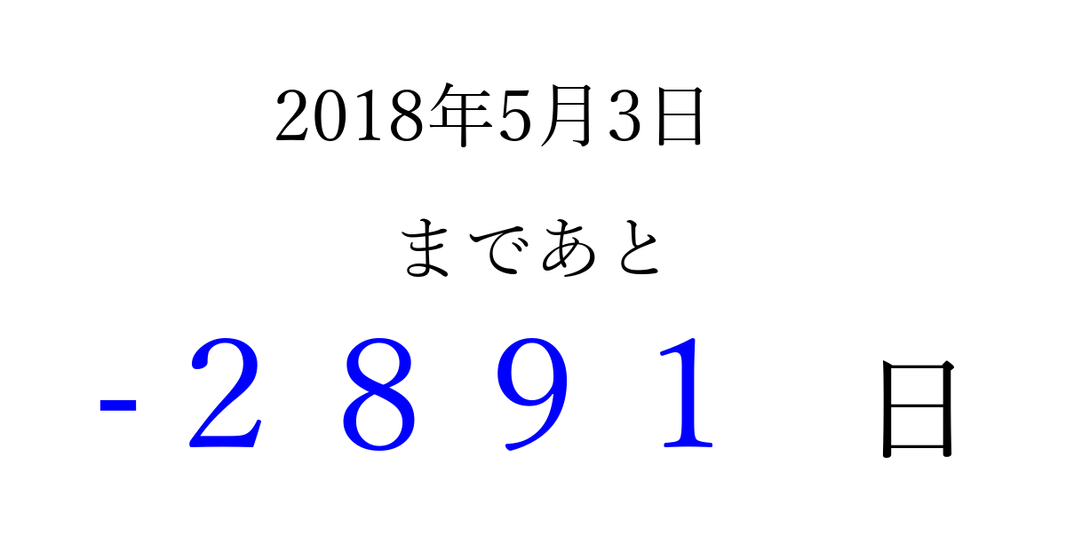 2018年5月3日(木)は もう 0000 日過ぎました 追加すると、トップページからすぐ選べるようになります ※2026/04/02現在の結果です。 最新の状態に更新する ↓シェアして、タイムライン上にカウントダウンを表示しよう!↓ 📤 この結果を共有する Tweet シェア Threads Bluesky この日は何の日?憲法記念日 別の日付でカウントダウン 2018年5月のカレンダー このページをブックマークに追加すると、いつでもカウントダウンを確認できます。 (PC: Ctrl+D / Mac: ⌘+D) hitome-notes.comでは以下のページも運営しています。 指定日と期間から日付を計算 | ガチャ確率計算・シミュレーション | プライバシー・ポリシー 運営者:Avocado