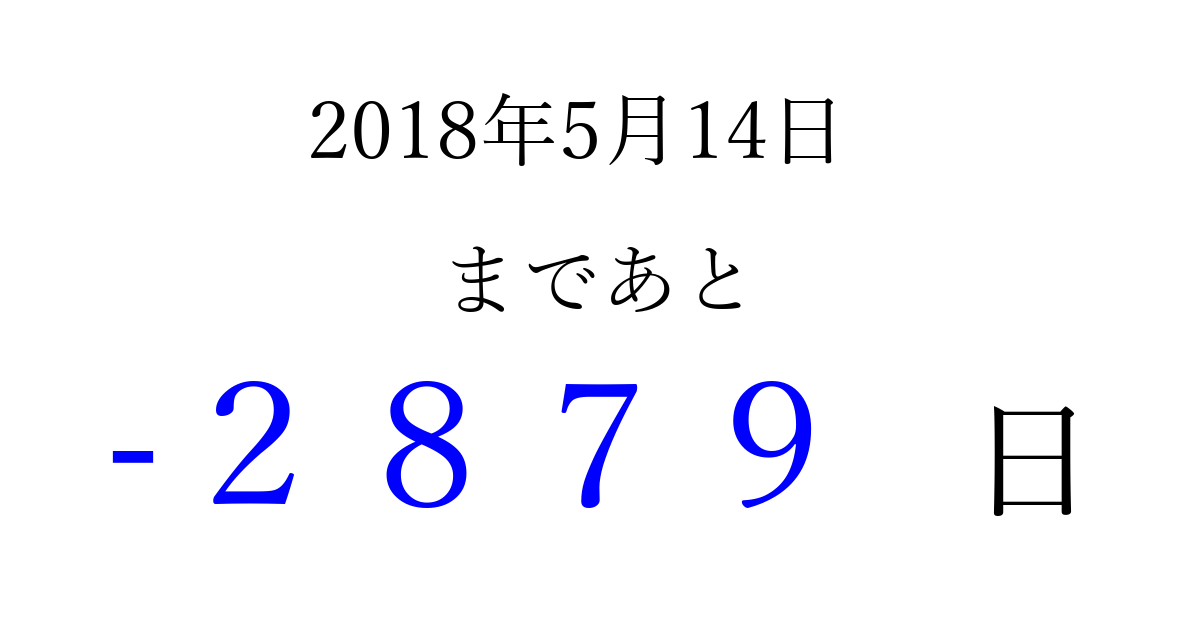 2018年5月14日(月)は もう 0000 日過ぎました 追加すると、トップページからすぐ選べるようになります ※2026/04/01現在の結果です。 最新の状態に更新する ↓シェアして、タイムライン上にカウントダウンを表示しよう!↓ 📤 この結果を共有する Tweet シェア Threads Bluesky 別の日付でカウントダウン 2018年5月のカレンダー このページをブックマークに追加すると、いつでもカウントダウンを確認できます。 (PC: Ctrl+D / Mac: ⌘+D) hitome-notes.comでは以下のページも運営しています。 指定日と期間から日付を計算 | ガチャ確率計算・シミュレーション | プライバシー・ポリシー 運営者:Avocado