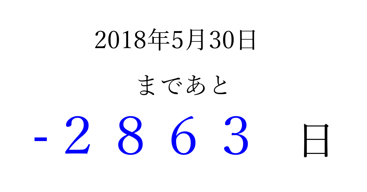 2018年5月30日(水)は もう 0000 日過ぎました 追加すると、トップページからすぐ選べるようになります ※2026/04/01現在の結果です。 最新の状態に更新する ↓シェアして、タイムライン上にカウントダウンを表示しよう!↓ 📤 この結果を共有する Tweet シェア Threads Bluesky 別の日付でカウントダウン 2018年5月のカレンダー このページをブックマークに追加すると、いつでもカウントダウンを確認できます。 (PC: Ctrl+D / Mac: ⌘+D) hitome-notes.comでは以下のページも運営しています。 指定日と期間から日付を計算 | ガチャ確率計算・シミュレーション | プライバシー・ポリシー 運営者:Avocado
