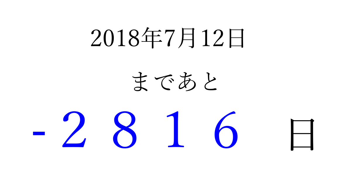 2018年7月12日(木)は もう 0000 日過ぎました 追加すると、トップページからすぐ選べるようになります ※2026/03/28現在の結果です。 最新の状態に更新する ↓シェアして、タイムライン上にカウントダウンを表示しよう!↓ 📤 この結果を共有する Tweet シェア Threads Bluesky 別の日付でカウントダウン 2018年7月のカレンダー このページをブックマークに追加すると、いつでもカウントダウンを確認できます。 (PC: Ctrl+D / Mac: ⌘+D) hitome-notes.comでは以下のページも運営しています。 指定日と期間から日付を計算 | ガチャ確率計算・シミュレーション | プライバシー・ポリシー 運営者:Avocado
