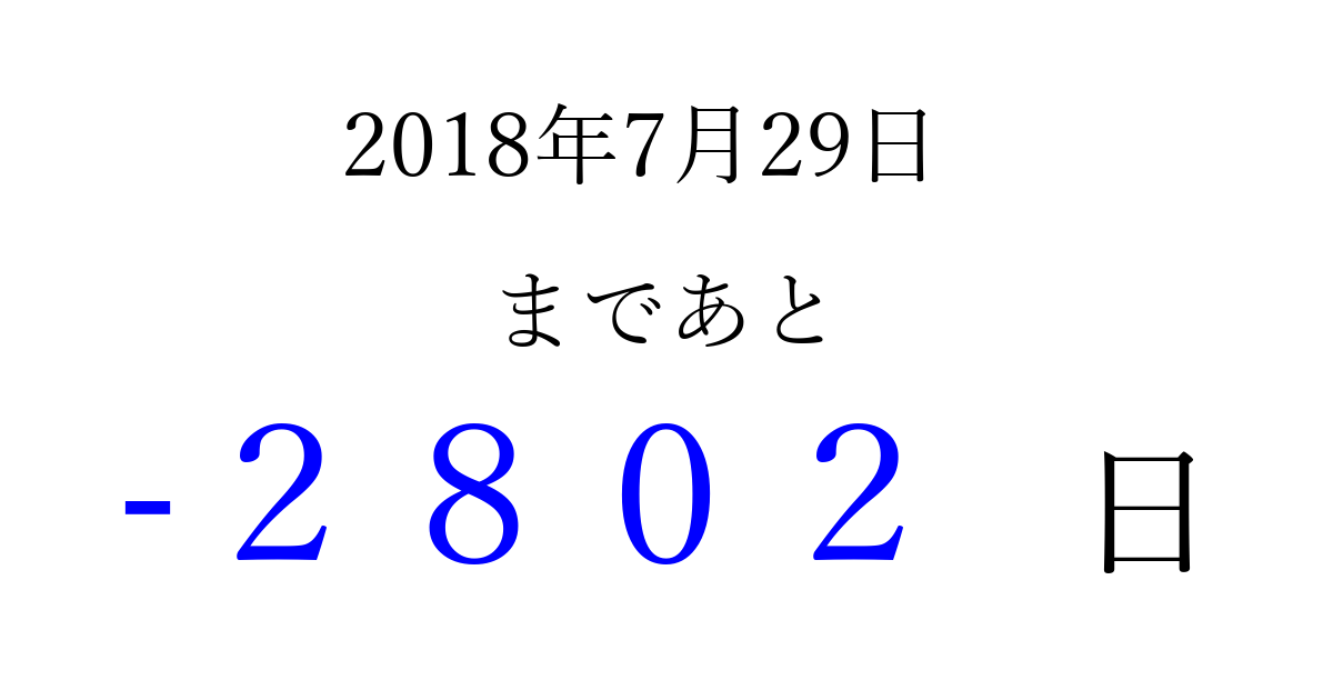 2018年7月29日(日)は もう 0000 日過ぎました 追加すると、トップページからすぐ選べるようになります ※2026/03/31現在の結果です。 最新の状態に更新する ↓シェアして、タイムライン上にカウントダウンを表示しよう!↓ 📤 この結果を共有する Tweet シェア Threads Bluesky 別の日付でカウントダウン 2018年7月のカレンダー このページをブックマークに追加すると、いつでもカウントダウンを確認できます。 (PC: Ctrl+D / Mac: ⌘+D) hitome-notes.comでは以下のページも運営しています。 指定日と期間から日付を計算 | ガチャ確率計算・シミュレーション | プライバシー・ポリシー 運営者:Avocado