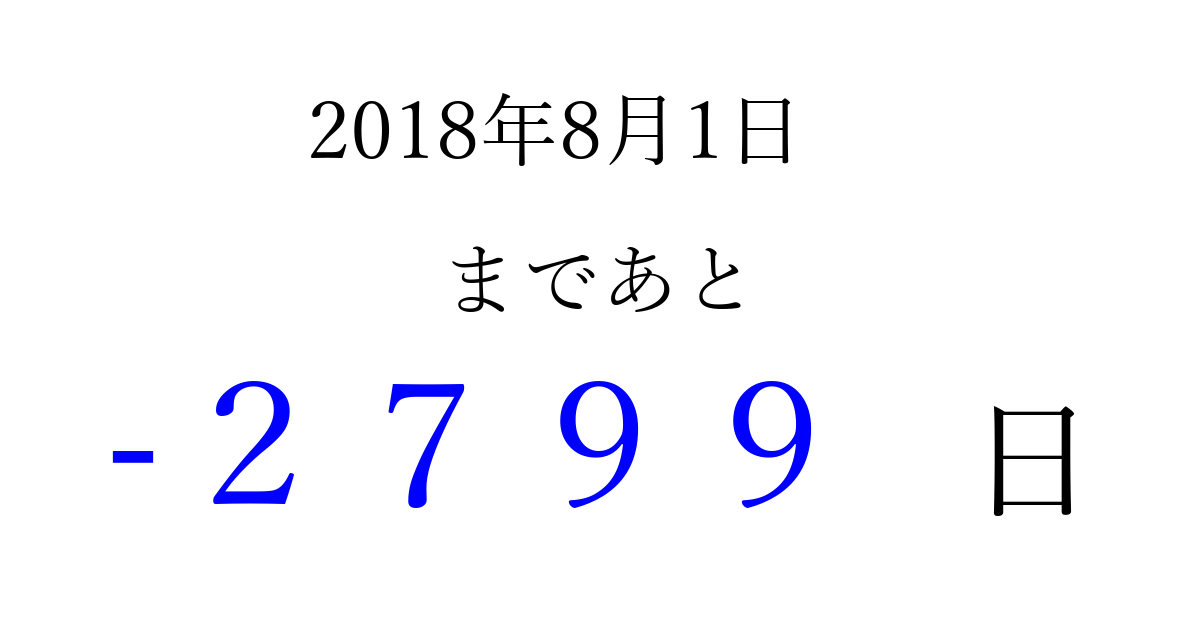 2018年8月1日(水)は もう 0000 日過ぎました 追加すると、トップページからすぐ選べるようになります ※2026/03/31現在の結果です。 最新の状態に更新する ↓シェアして、タイムライン上にカウントダウンを表示しよう!↓ 📤 この結果を共有する Tweet シェア Threads Bluesky 別の日付でカウントダウン 2018年8月のカレンダー このページをブックマークに追加すると、いつでもカウントダウンを確認できます。 (PC: Ctrl+D / Mac: ⌘+D) hitome-notes.comでは以下のページも運営しています。 指定日と期間から日付を計算 | ガチャ確率計算・シミュレーション | プライバシー・ポリシー 運営者:Avocado