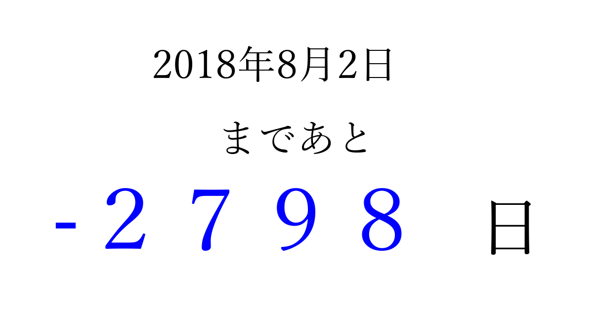 2018年8月2日(木)は もう 0000 日過ぎました 追加すると、トップページからすぐ選べるようになります ※2026/03/31現在の結果です。 最新の状態に更新する ↓シェアして、タイムライン上にカウントダウンを表示しよう!↓ 📤 この結果を共有する Tweet シェア Threads Bluesky 別の日付でカウントダウン 2018年8月のカレンダー このページをブックマークに追加すると、いつでもカウントダウンを確認できます。 (PC: Ctrl+D / Mac: ⌘+D) hitome-notes.comでは以下のページも運営しています。 指定日と期間から日付を計算 | ガチャ確率計算・シミュレーション | プライバシー・ポリシー 運営者:Avocado