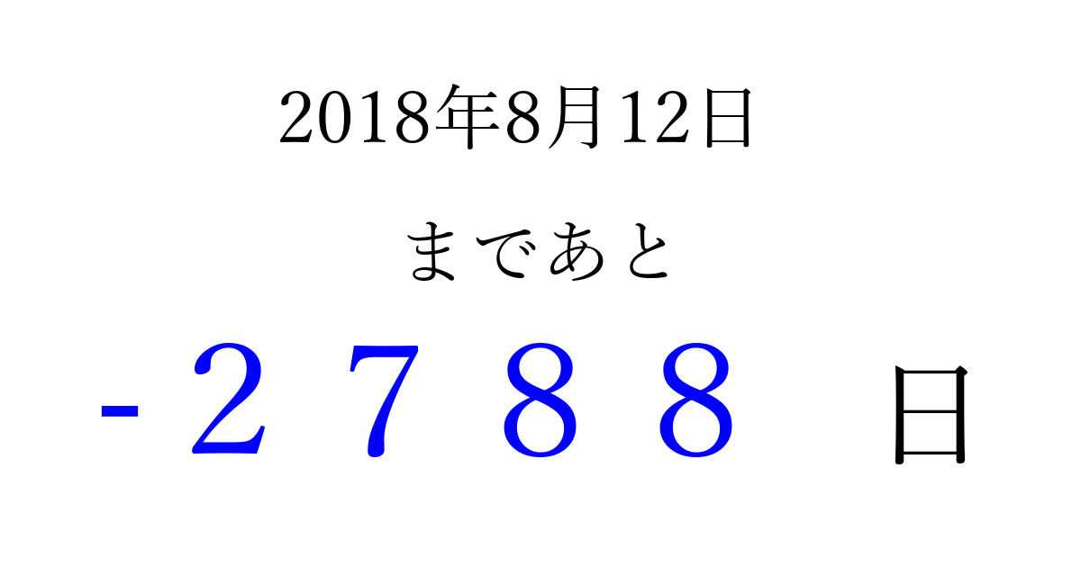 2018年8月12日(日)は もう 0000 日過ぎました 追加すると、トップページからすぐ選べるようになります ※2026/03/31現在の結果です。 最新の状態に更新する ↓シェアして、タイムライン上にカウントダウンを表示しよう!↓ 📤 この結果を共有する Tweet シェア Threads Bluesky 別の日付でカウントダウン 2018年8月のカレンダー このページをブックマークに追加すると、いつでもカウントダウンを確認できます。 (PC: Ctrl+D / Mac: ⌘+D) hitome-notes.comでは以下のページも運営しています。 指定日と期間から日付を計算 | ガチャ確率計算・シミュレーション | プライバシー・ポリシー 運営者:Avocado