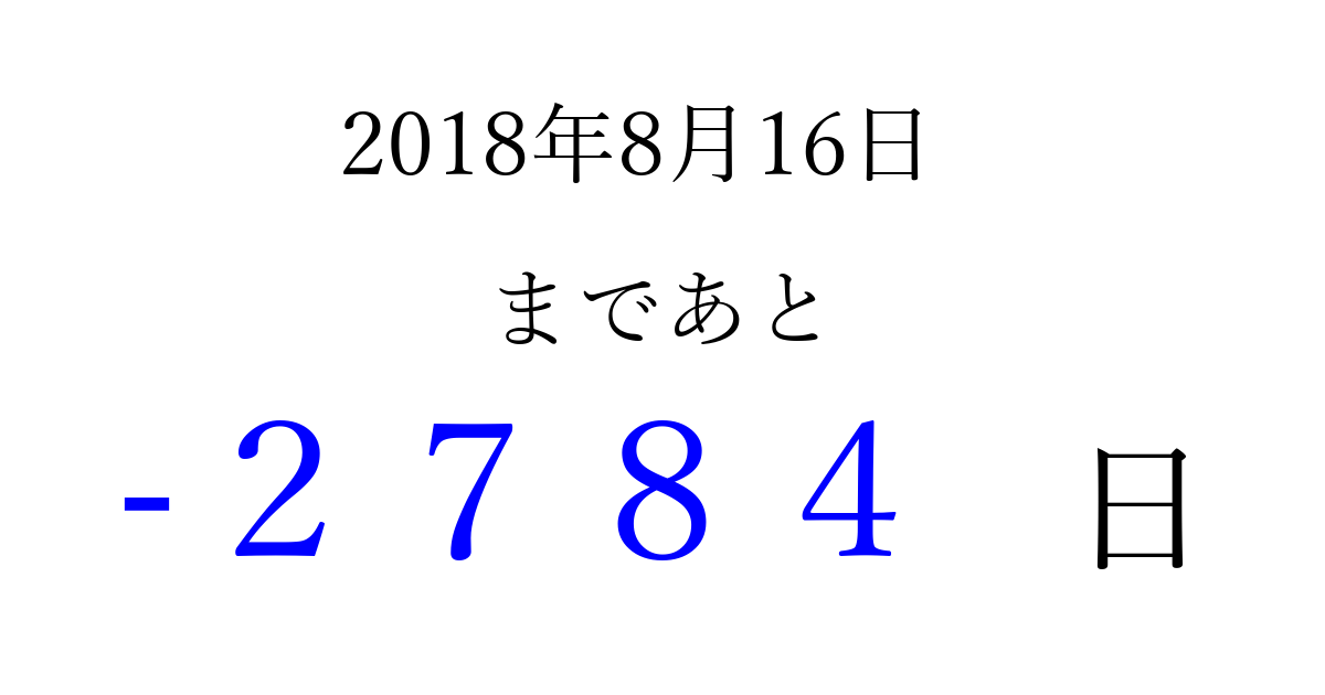 2018年8月16日(木)は もう 0000 日過ぎました 追加すると、トップページからすぐ選べるようになります ※2026/03/31現在の結果です。 最新の状態に更新する ↓シェアして、タイムライン上にカウントダウンを表示しよう!↓ 📤 この結果を共有する Tweet シェア Threads Bluesky 別の日付でカウントダウン 2018年8月のカレンダー このページをブックマークに追加すると、いつでもカウントダウンを確認できます。 (PC: Ctrl+D / Mac: ⌘+D) hitome-notes.comでは以下のページも運営しています。 指定日と期間から日付を計算 | ガチャ確率計算・シミュレーション | プライバシー・ポリシー 運営者:Avocado