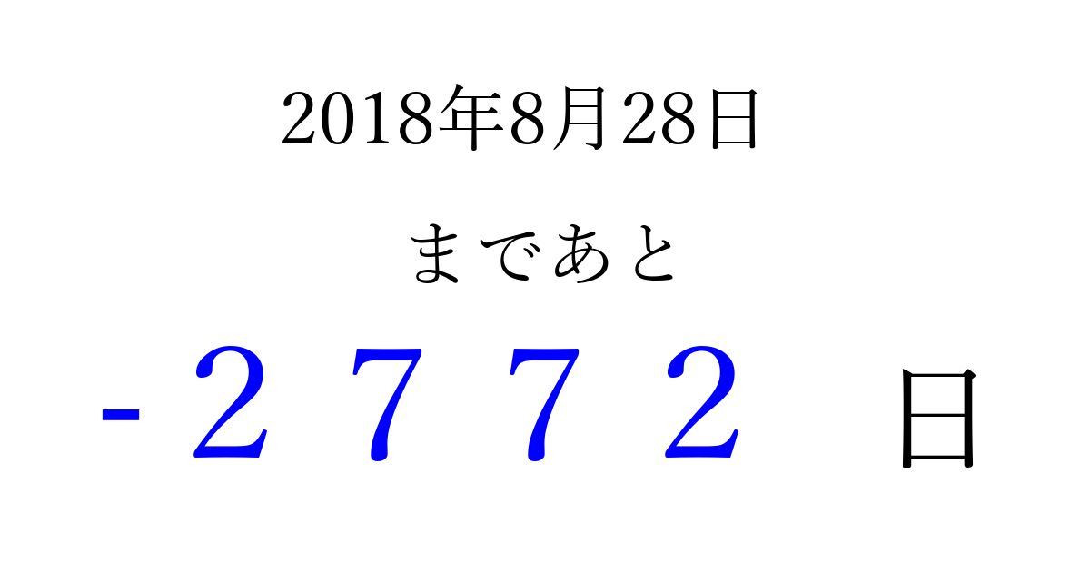 2018年8月28日(火)は もう 0000 日過ぎました 追加すると、トップページからすぐ選べるようになります ※2026/03/31現在の結果です。 最新の状態に更新する ↓シェアして、タイムライン上にカウントダウンを表示しよう!↓ 📤 この結果を共有する Tweet シェア Threads Bluesky 別の日付でカウントダウン 2018年8月のカレンダー このページをブックマークに追加すると、いつでもカウントダウンを確認できます。 (PC: Ctrl+D / Mac: ⌘+D) hitome-notes.comでは以下のページも運営しています。 指定日と期間から日付を計算 | ガチャ確率計算・シミュレーション | プライバシー・ポリシー 運営者:Avocado