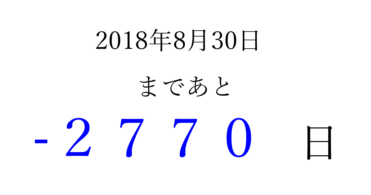 2018年8月30日(木)は もう 0000 日過ぎました 追加すると、トップページからすぐ選べるようになります ※2026/03/31現在の結果です。 最新の状態に更新する ↓シェアして、タイムライン上にカウントダウンを表示しよう!↓ 📤 この結果を共有する Tweet シェア Threads Bluesky 別の日付でカウントダウン 2018年8月のカレンダー このページをブックマークに追加すると、いつでもカウントダウンを確認できます。 (PC: Ctrl+D / Mac: ⌘+D) hitome-notes.comでは以下のページも運営しています。 指定日と期間から日付を計算 | ガチャ確率計算・シミュレーション | プライバシー・ポリシー 運営者:Avocado